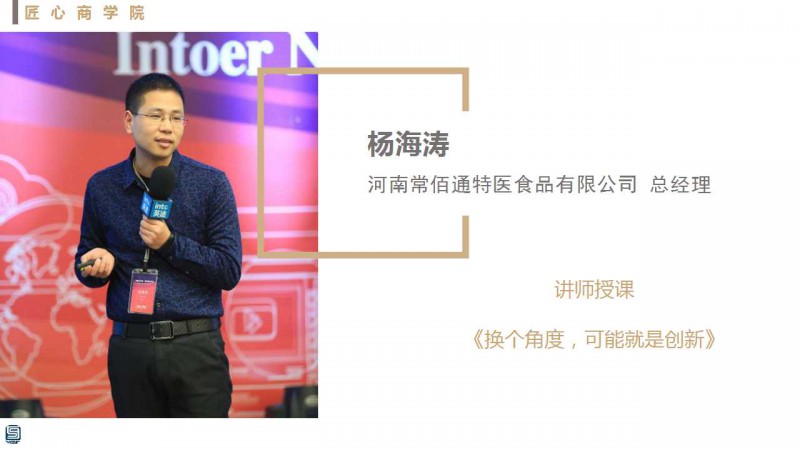 三、15:50-16:00 課間休息 《換個(gè)角度,可能就是創(chuàng)新(二)》——河南常佰通特醫(yī)食品有限公司 總經(jīng)理 楊海濤先生