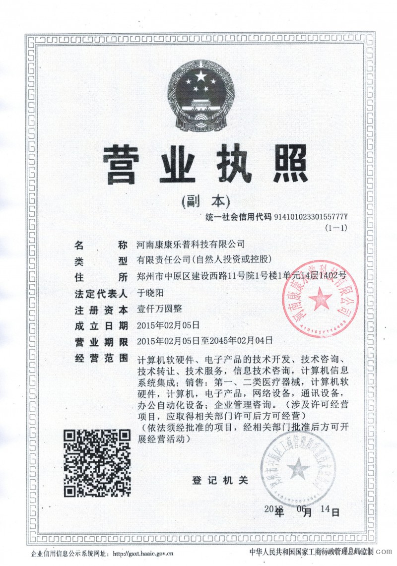 | 發(fā)證機(jī)構(gòu): | ??工商管理局 | 發(fā)證時(shí)間 : | ??2018-06-14 |