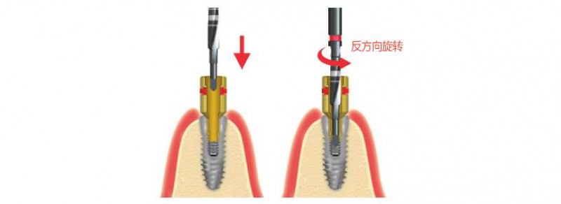 ③使用螺絲取出器取出斷裂的螺絲去除植體上邊連接的定位器選取合適的螺絲取出器,連接種植機的手機后逆時針低速(80rpm以下)旋轉(zhuǎn)取出螺絲。連接螺絲取出器和螺絲取出器連接桿手動擰出,或連接扭力扳手擰出。